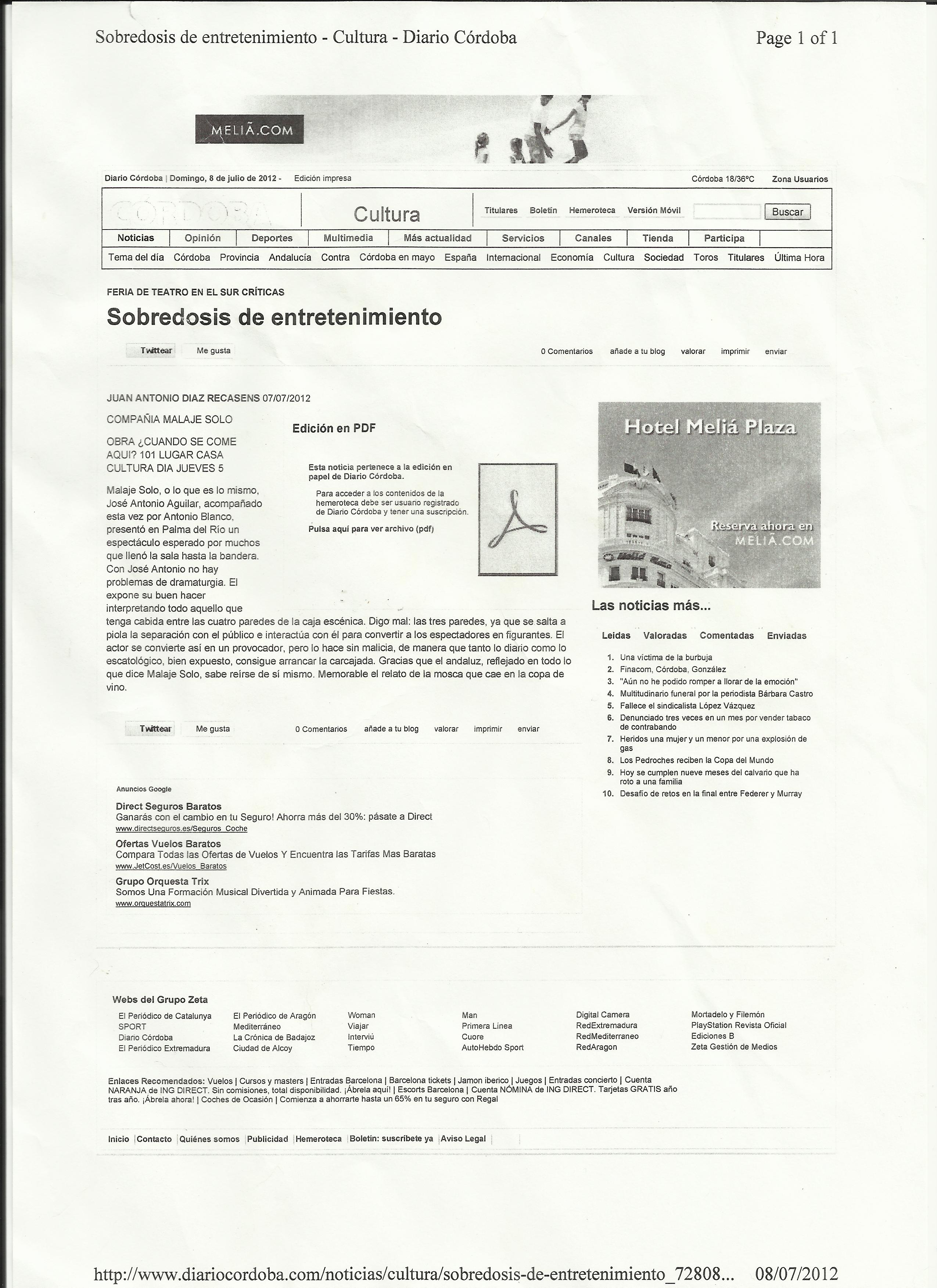 “Una buena dosis en forma de monólogo repleta de chistes inteligentes made in Carmona (Sevilla), a base de interpretación, mimo, voces, y greguería visual… una hora y pico de interacción con el público que no sólo ríe con razón, sino que participa, charla con malaje y se convierte en un agradecido actor de reparto… pero sobre todo es gesto constante. Es la prueba de que José Antonio Aguilar es uno de esos actores que hagan lo que hagan lo van a hacer bien. Un valor que cotiza en bolsa y está en alza.”